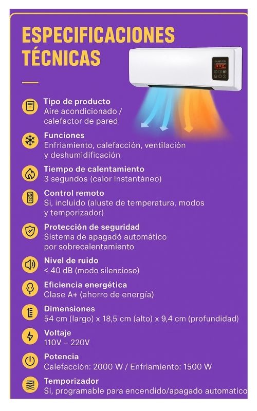 ClimaMax™ brinda calor y frescura en segundos, ideal para mantener la temperatura en cualquier estación del año. Con control remoto, funcionamiento silencioso y bajo consumo energético, asegura confort sin interrupciones y fácil de usar.